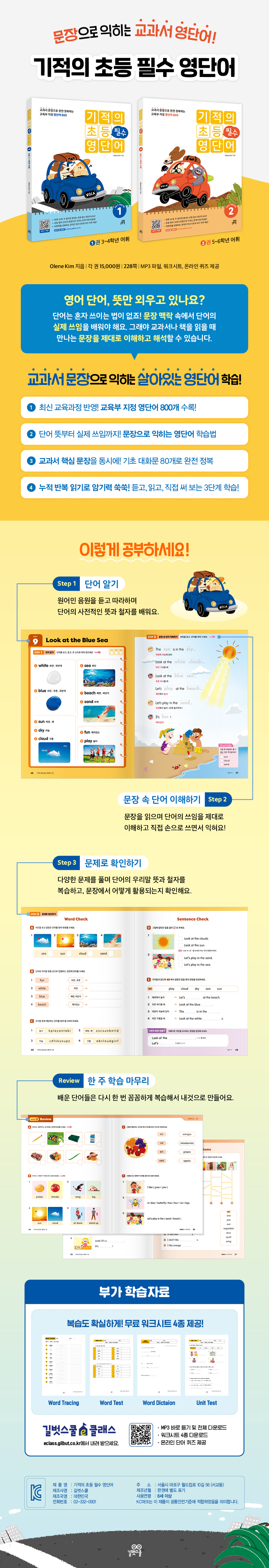 아직도 영단어 뜻만 달달 외우고 있나요? 단어는 혼자서 쓰이는 법이 없죠! 글을 읽고 대화를 나누는 상황에서 존재합니다. 그러므로 단어는 문장의 문맥 속에서 제대로 배워야 더 오래오래 기억할 수 있습니다. <기적의 초등 필수 영단어>는 초등학생이 꼭 알아야 할 교육부 지정 영단어 800개를 교과서 문장으로 배워 단어의 실제 쓰임을 익히도록 합니다. 더불어 교과과정에서 강조하는 교과서 의사소통 기능문을 사용한 대화글 80개로 핵심 문장을 동시에 익힐 수 있습니다. 부담 없이 하루 10개의 영단어로 교과서 주요 문형과 필수 단어를 익혀가는 일석이조의 효과를 맛보세요!