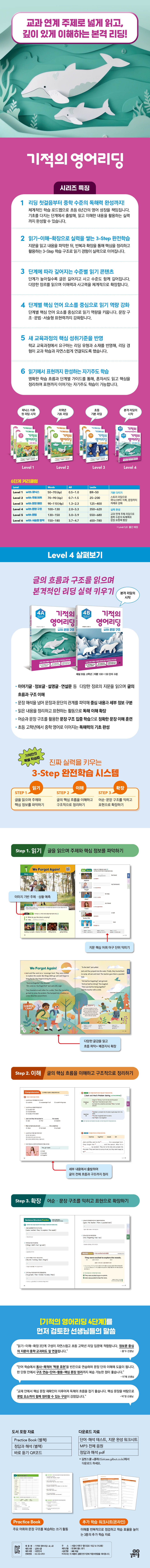 기적의 영어리딩 Level 4는 이야기글, 정보글, 설명글, 연설문 등 교과에서 접하는 다양한 주제와 장르의 지문을 읽으며, 문장 이해를 넘어 글 전체의 흐름과 구조를 파악하는 본격적인 리딩 훈련에 초점을 둡니다.